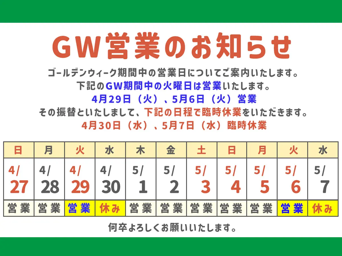 【ゴールデンウィーク期間中の営業日について】