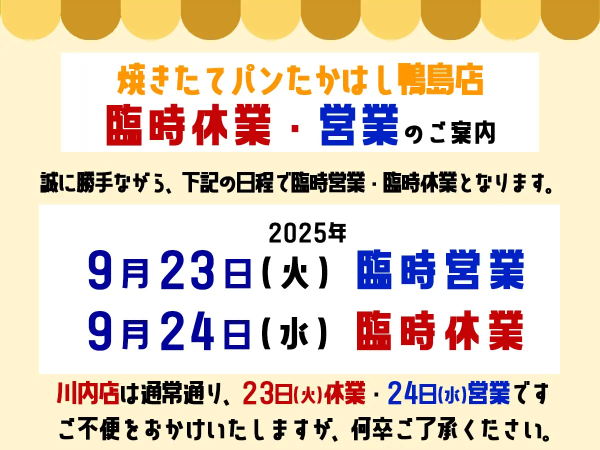 焼きたてパンたかはし鴨島店 臨時営業・臨時休業のお知らせ